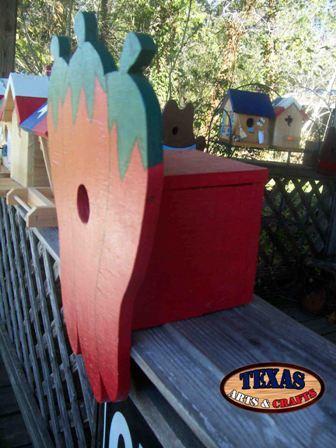 Chili Pepper Bird House We hand make an item called the Chili Pepper Bird House. We build the bird house out of cedar in our workshop. The bird house is cut out in the shape of Chili Peppers. The bird house is hand painted red with a green stem at the top. The birds seem to really like this bird house. Some of the birds that will nest in this box are American Kestrel, the Great Crested Flycatcher, Wrens, Chickadees, Nuthatches, Titmice, Swallows, and Woodpeckers. For more information about these birds go to Backyard Birds. The dimensions are 16 inches tall by 11 inches wide by 7 inches deep. The bird house weighs approximately 3.75 pounds with packaging. For the continental U.S. shipping and handling is included in the listed price. For shipping outside the continental U.S. please contact us through our Contact Us page. Price $50.00 (Price Includes Shipping) Home Contact Us Privacy Policy FAQ About Us Purple Martin Bird House Blue Bird House Texas Crafts Farm House Bird House Cactus Bird House Hat Bird House |