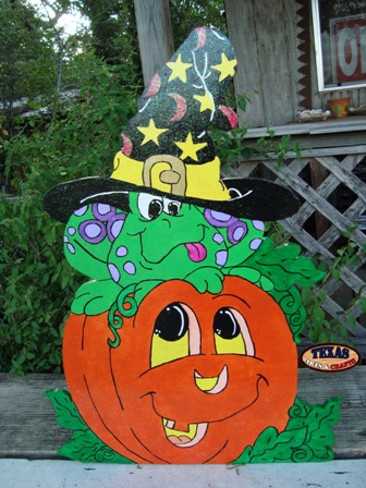 Frog With Pumpkin The Frog With Pumpkin yard sign is built in our workshop. The pumpkin is hand painted orange. The frog is painted green with purple spots. The frog is wearing a black hat with stars and moons on it. The dimensions for the yard sign are 29 inches tall by 21 inches wide by 1.50 inches deep. The yard art has a 26.50 inch stake. The weight with packaging is 5 pounds. For the continental U.S. shipping and handling is included in the listed price. For shipping outside the continental U.S. please contact us through our Contact Us page. Price $62.00 (Price Includes Shipping) Giant Pumpkin