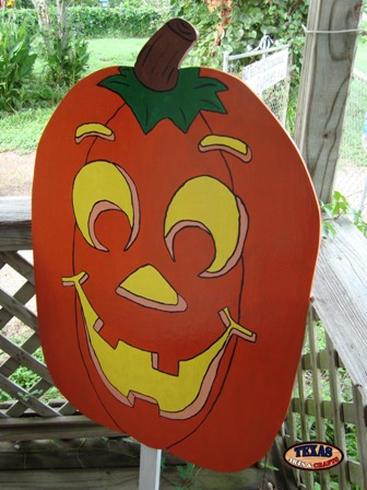 Big Smile Pumpkin The Big Smile Pumpkin yard sign is built in our workshop. The pumpkin is hand painted orange. A big smile funny face is painted onto the pumpkin. The dimensions for the yard sign are 16 inches tall by 10.50 inches wide by 1.50 inches deep. The yard art has a 16 inch stake. The weight with packaging is 2.50 pounds. For the continental U.S. shipping and handling is included in the listed price. For shipping outside the continental U.S. please contact us through our Contact Us page. Price $42.50 (Price Includes Shipping) Three Tiny Pumpkins