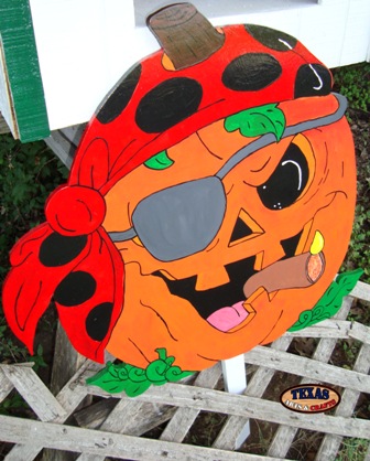Giant Pumpkin The Giant Pumpkin yard sign is built in our workshop. The pumpkin is hand painted orange. The eyes, mouth and nose are painted yellow. The dimensions for the yard sign are 33.50 inches tall by 23 inches wide by 1.50 inches deep. The yard art has a 36 inch stake. The weight with packaging is 5 pounds. For the continental U.S. shipping and handling is included in the listed price. For shipping outside the continental U.S. please contact us through our Contact Us page. Price $97.00 (Price Includes Shipping) Pirate Pumpkin