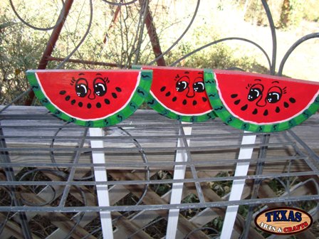 Three Lady Bugs We make a set of Three Lady Bugs. The lady bugs are built in our workshop. The lady bugs are hand painted red with black dots. The individual dimensions are 4.25 inches tall by 9 inches wide by 1 inch deep. The peg is 10 inches tall. The combined depth is 5 inches with packaging The weight for the three signs with packaging is 2.50 pounds. For the continental U.S. shipping and handling is included in the listed price. For shipping outside the continental U.S. please contact us through our Contact Us page. Price $28 (Price Includes Shipping) Three Watermelons