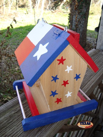 Texas Star Cafe We hand make an item called the Texas Star Cafe. The bird feeder is built out of cedar in our workshop. The Texas flag is hand painted onto the roof. Red, white, and blue stars are painted onto the sides of the bird feeder. The size and colors may vary slightly as it is hand crafted. Some of the birds that will be attracted to the bird feeder are the American Kestrel, the Great Crested Flycatcher, Wrens, Chickadees, Nuthatches, Titmice, Swallows, Blue birds, Mockingbirds, and Woodpeckers. For more information about these birds go to Backyard Birds, Blue Birds, and Purple Martin Birds. The bird feeder is 9 inches tall by 9 inches wide by 7.5 inches deep. The bird feeder weighs approximately 3 pounds with packaging. For the continental U.S. shipping and handling is included in the listed price. For shipping outside the continental U.S. please contact us through our Contact Us page. Price $57.00 (Price Includes Shipping) Texas Starz Cafe